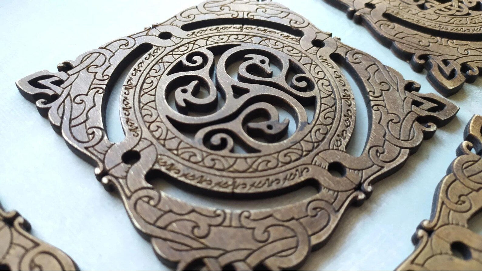Set coastere din lemn cu model celtic pentru toți cei care cred că protejarea mobilei poate fi atât practică, cât și spirituală, acest set de suporturi este exact ce aveai nevoie și n-ai știut că vrei. Modele celtice atent decupate din lemn, cu precizia unui elf tâmplar care face terapie prin geometrie sacră.